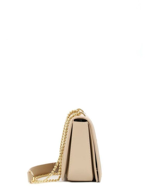 Дамска чанта за през рамо в бежово с ватирана текстура и шипове, преден капак и регулируема/разглобяема презрамка с верижка. Изработена от изкуствена кожа. Предлага се със защитна торбичка за прах.