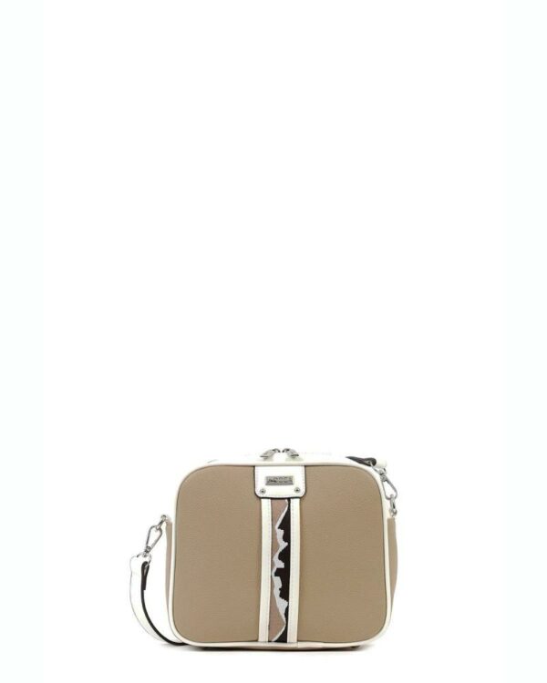 Дамска малака чанта чанта в екрю с геометричен дизайн, декоративни детайли, регулируема/сваляща се презрамка, сребриста закопчалка и цветен принт. Изработени от изкуствена кожа.