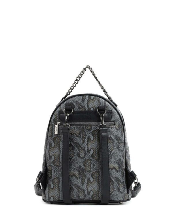 Раница в сиво с външен джоб, верига, регулируеми/разглобяеми презрамки и текстура на змия. Изработена от кожа PU.