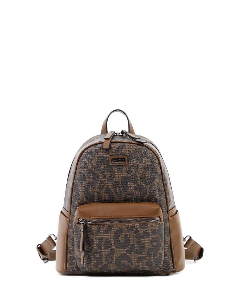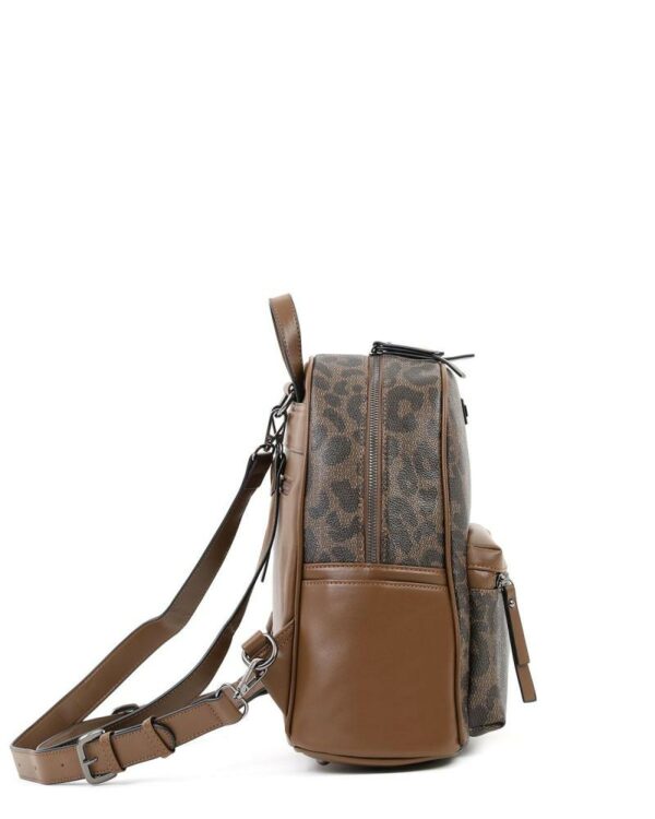 Дамска раница в кафяв цвят с леопардов принт, странични джобове, регулируеми/свалящи се презрамки и външен джоб. Изработен от pvc.