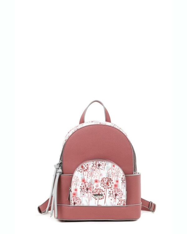 Дамска раница в розово с флорален принт, ресни, регулируеми/свалящи се презрамки, сребриста закопчалка, декоративни детайли и външен джоб. Изработен от pvc.