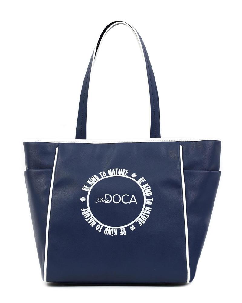 Дамска чанта в синьо с щампа и бели детайли. Изработена от 100% рециклирана изкуствена кожа.