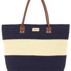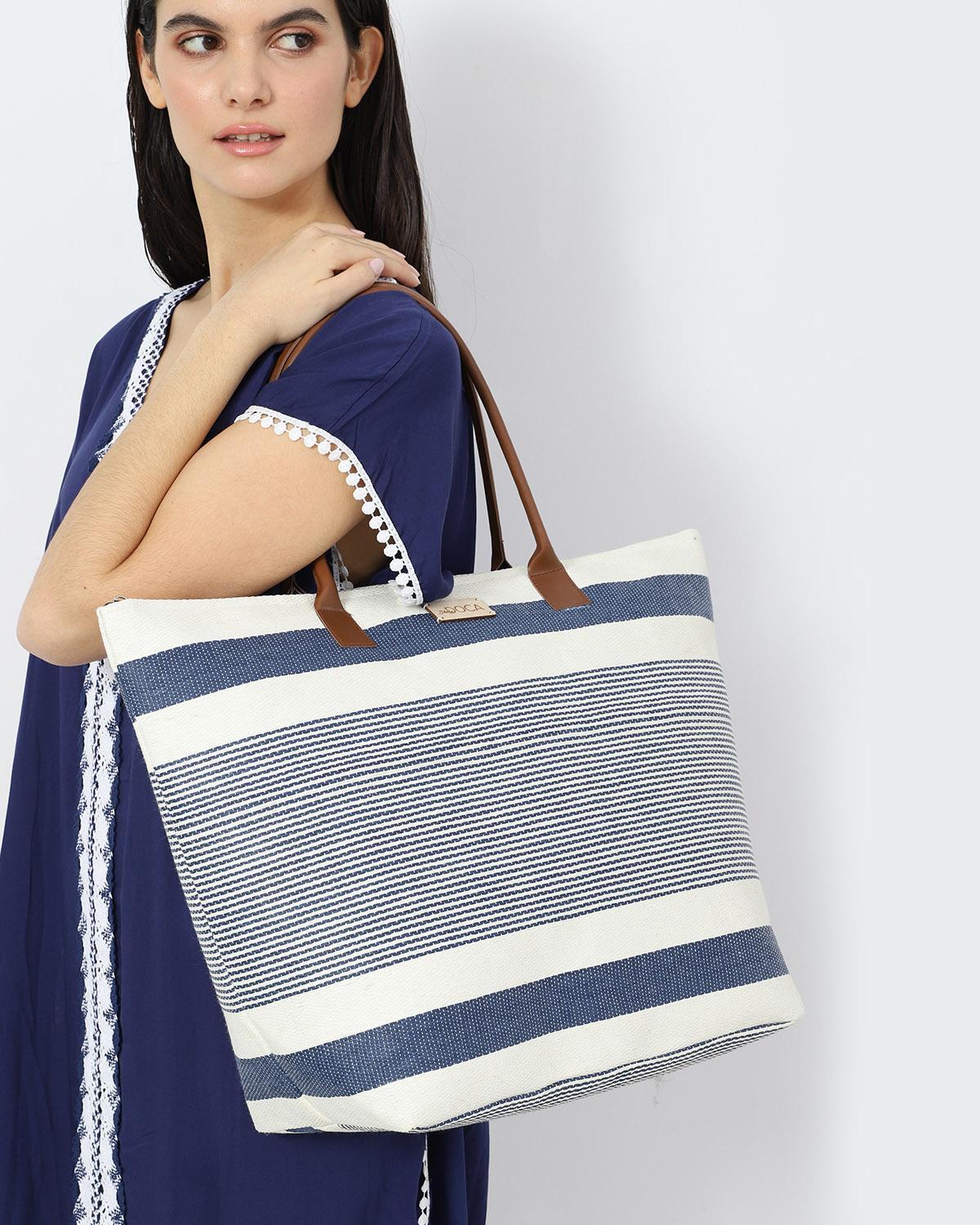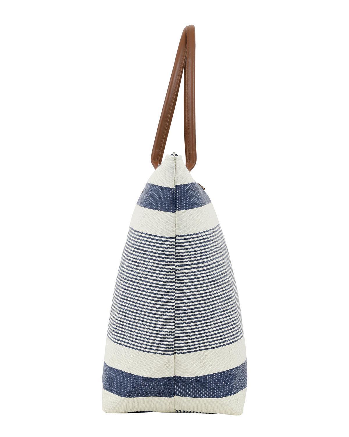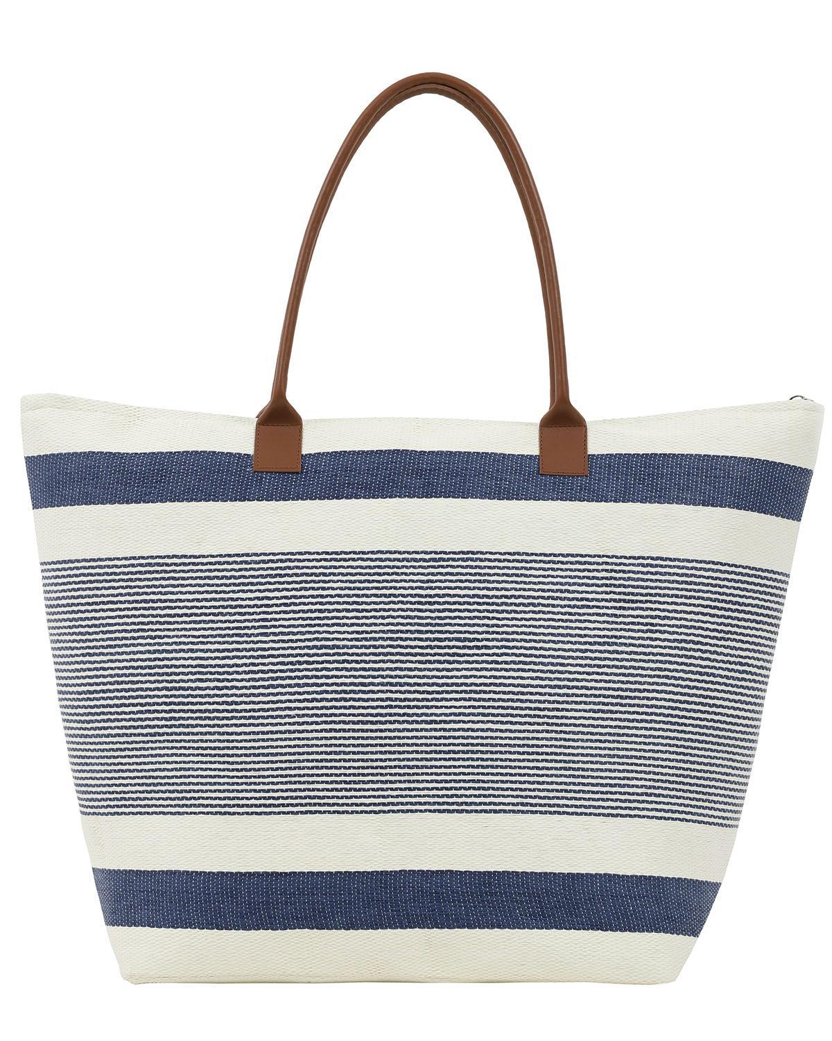 Хартиена сламена чанта за плаж в синьо с райе дизайн. Изработена от 95% хартиена слама, 5% PU кожа.