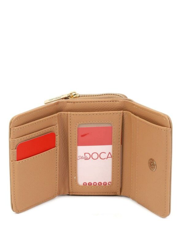 Портфейл от камила с преден капак. Изработена от изкуствена кожа. Той побира слотове за карти и джоб за монети и ще го получите в кутия на DOCA.